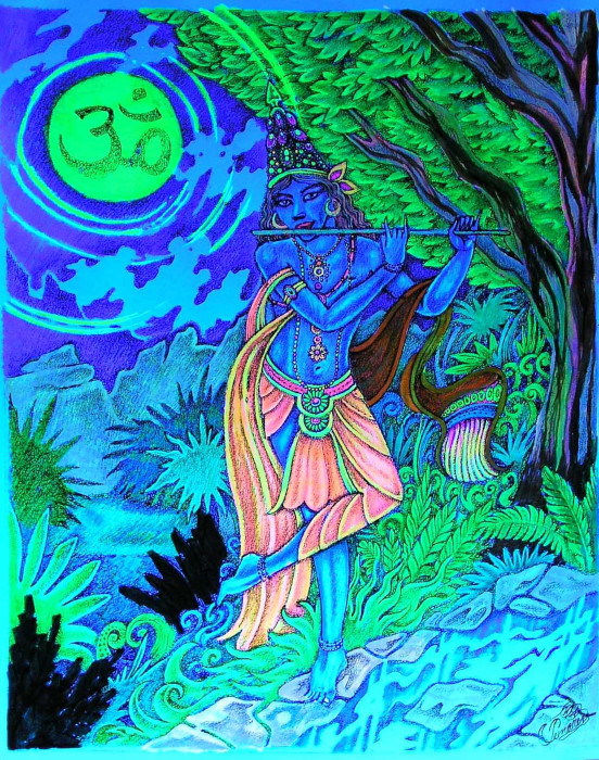 Forgetting their customary reserve and modesty, they left their work and houses as soon as they heard the hauntingly beautiful sound of His flute, the irresistible call to love which had made His name synonymous with joyful pleasure and eroticism.